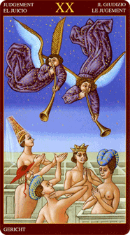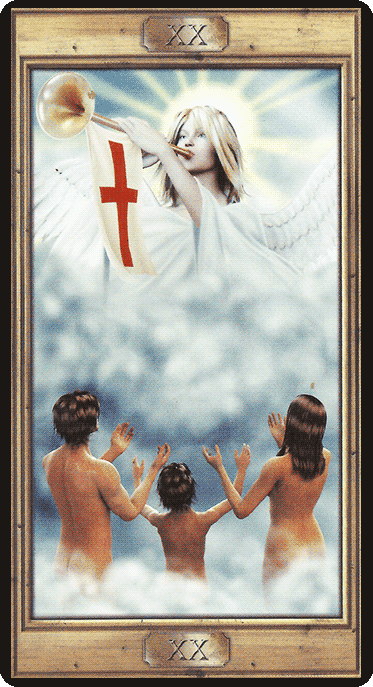 Symbolism and imagery. In the Judgement tarot card art, an angel blows a trumpet, calling people to rise – a symbol of rebirth and divine truth. It connects heaven and earth, reminding us that true change begins from within. The XX Judgement tarot represents enlightenment after trials – a celebration of life, growth, and liberation.