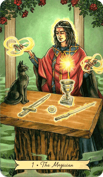 The tarot card The Magician carries many faces: the Wizard, the Alchemist, the Healer, the Juggler, the Illusionist, the Trickster, even the Adventurer and Manipulator. Like the legendary Merlin, the Magician in tarot embodies mastery of the elements and the art of transformation. On the table before him lie the four symbols of the suits – the wand, the cup, the sword, and the pentacle. They stand for the four directions, four seasons, and four elements: fire, water, air, and earth.