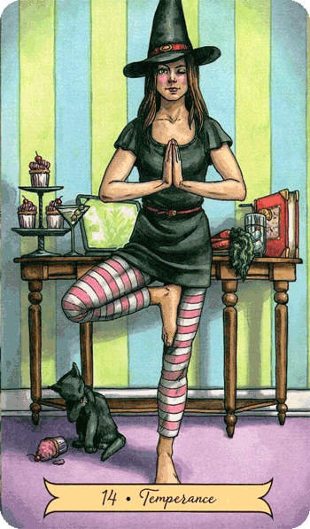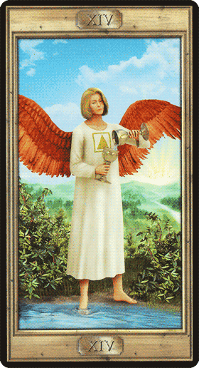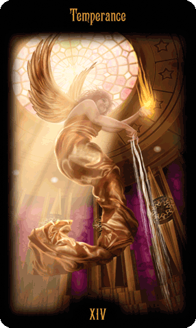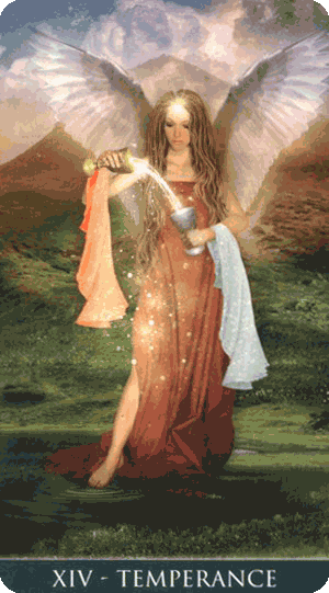 Temperance card as action. Temperance card as action means small, steady steps. Act with composure and careful mixing of ideas. Move slowly and do one small task at a time. Temperance tarot element is a blend of water and air. Temperance tarot energy is calm creative flow. Think of temperance tarot heaven as higher guidance and support.