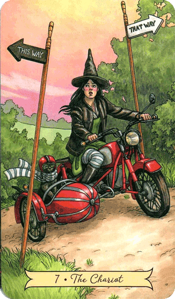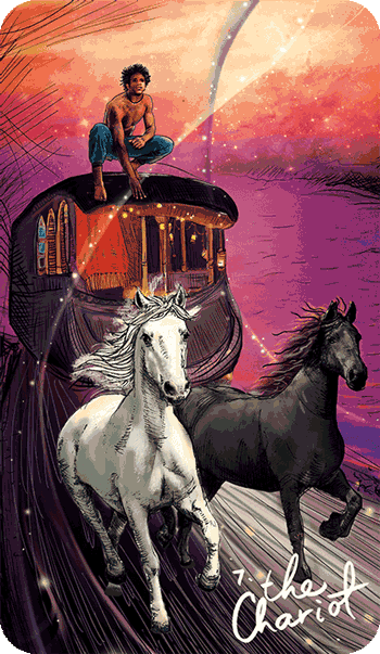 The Chariot + Page of Wands – Overcoming doubts to fulfill a long-held desire.