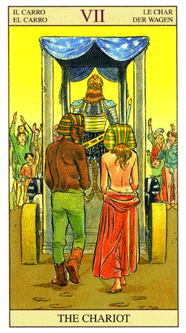 The Chariot and Empress tarot combinations (VII + III). Movement toward prosperity. Change of surroundings, new direction. Busy schedule, many tasks. Woman behind the wheel, trip with a woman. Love used as a tool, strong image or fashion.