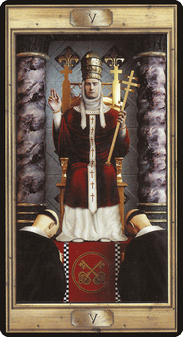 Hierophant + Five of Wands – serious conflict with parents or a great wave of misunderstanding.