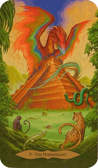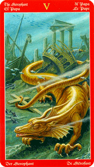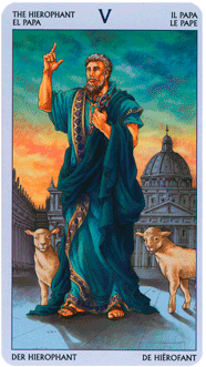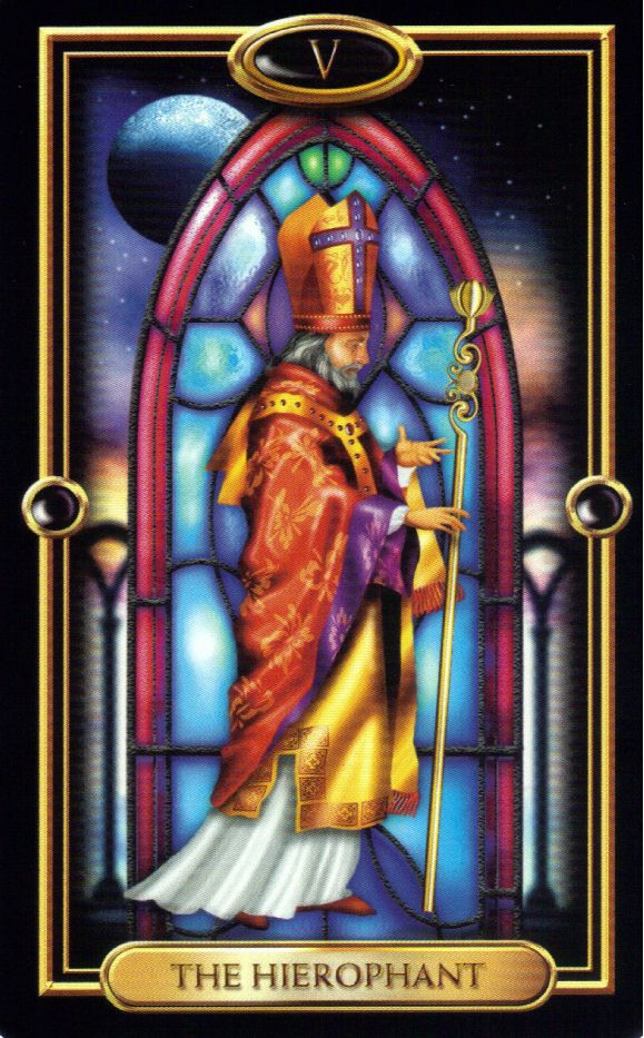 Hierophant + Moon (V + XVIII). Sectarianism. Shifting philosophy. Disappointment in beliefs. Uncertain faith. False convictions. Pagan morality.