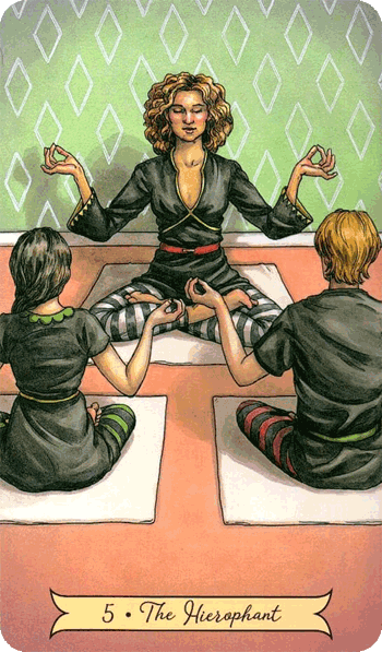 Hierophant + Hanged Man (V + XII). Outdated views and rigid dogma. Hermit-like life. Teachings of meditation.